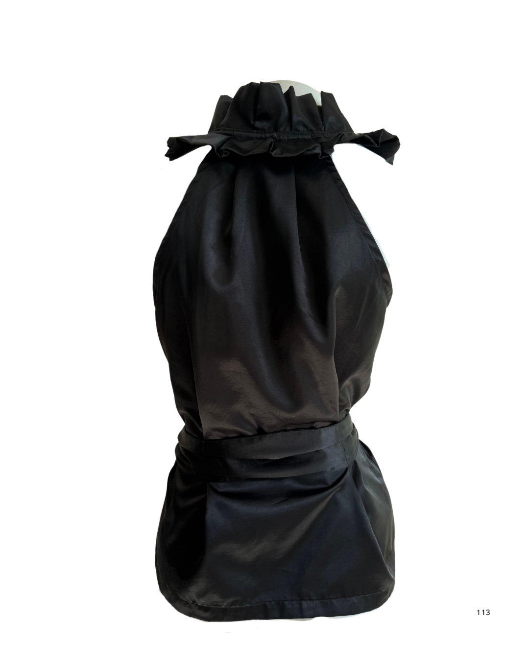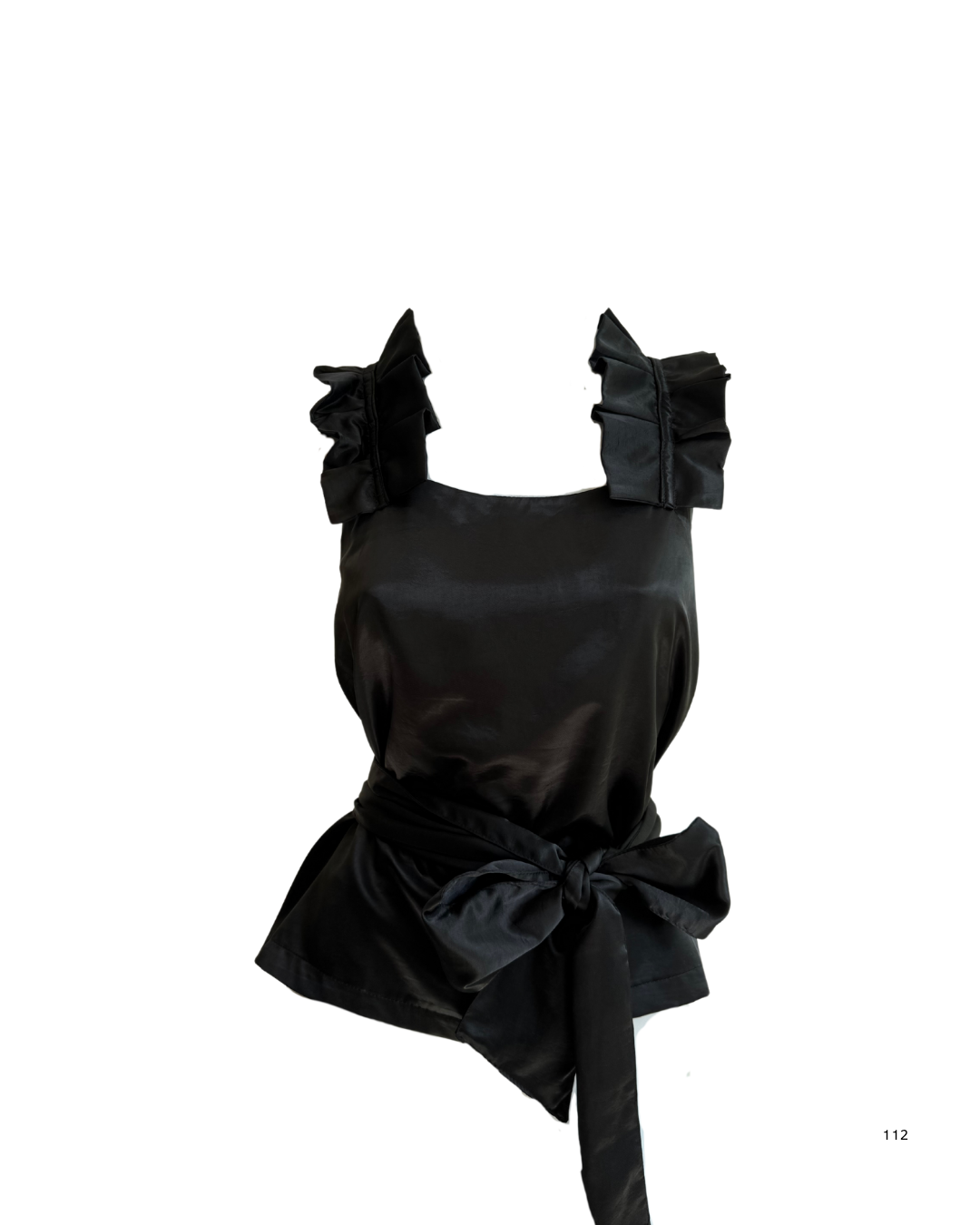 Descrição: blusa preta de cetim com faixa na cintura