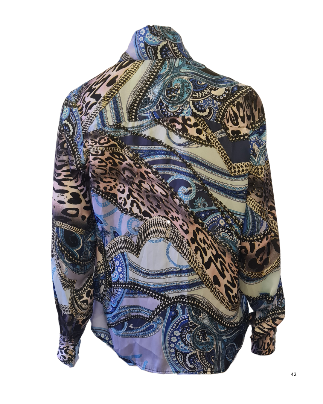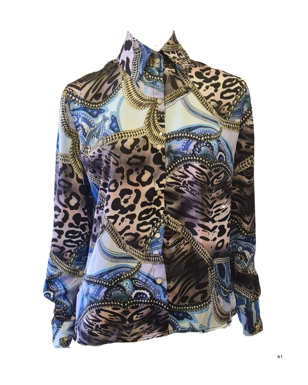 Descrição: Camisa estampada lilás, azul e animal print